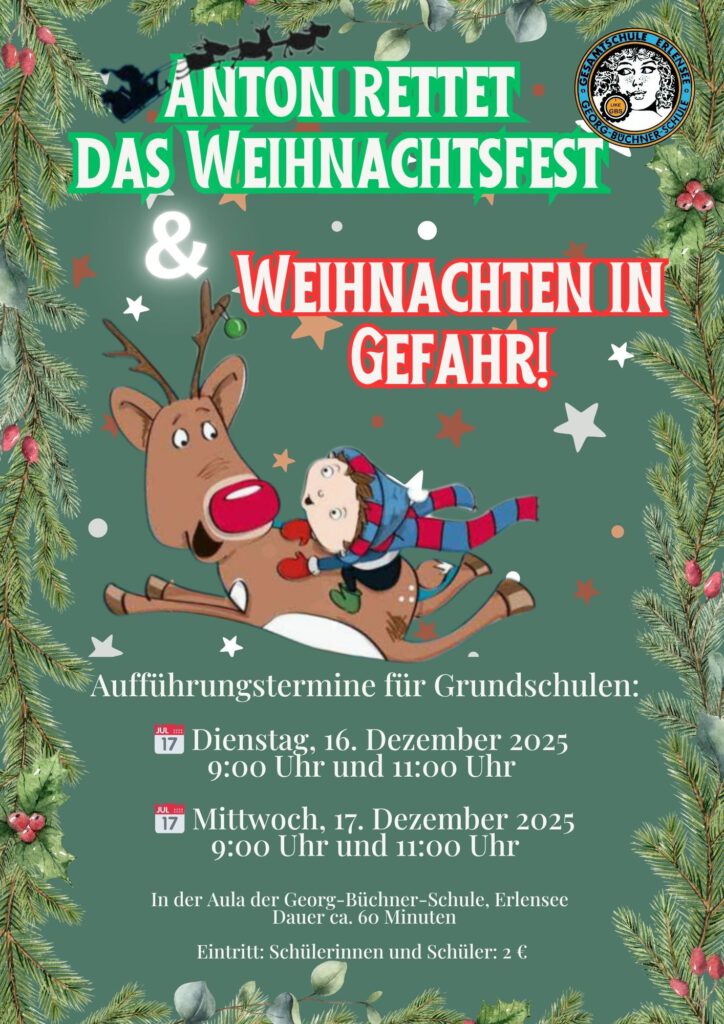 Die Georg-Büchner-Schule in Erlensee öffnet in der Vorweihnachtszeit ihre Türen für ein besonderes Theatererlebnis. Die WPU-Kurse „Darstellendes Spiel“ der Jahrgänge 7 und 8 bringen unter der Leitung von Frau Schäfer und Frau Daus zwei Stücke nach Helga Franzke auf die Bühne: „Anton rettet das Weihnachtsfest“ und „Weihnachten in Gefahr“.
