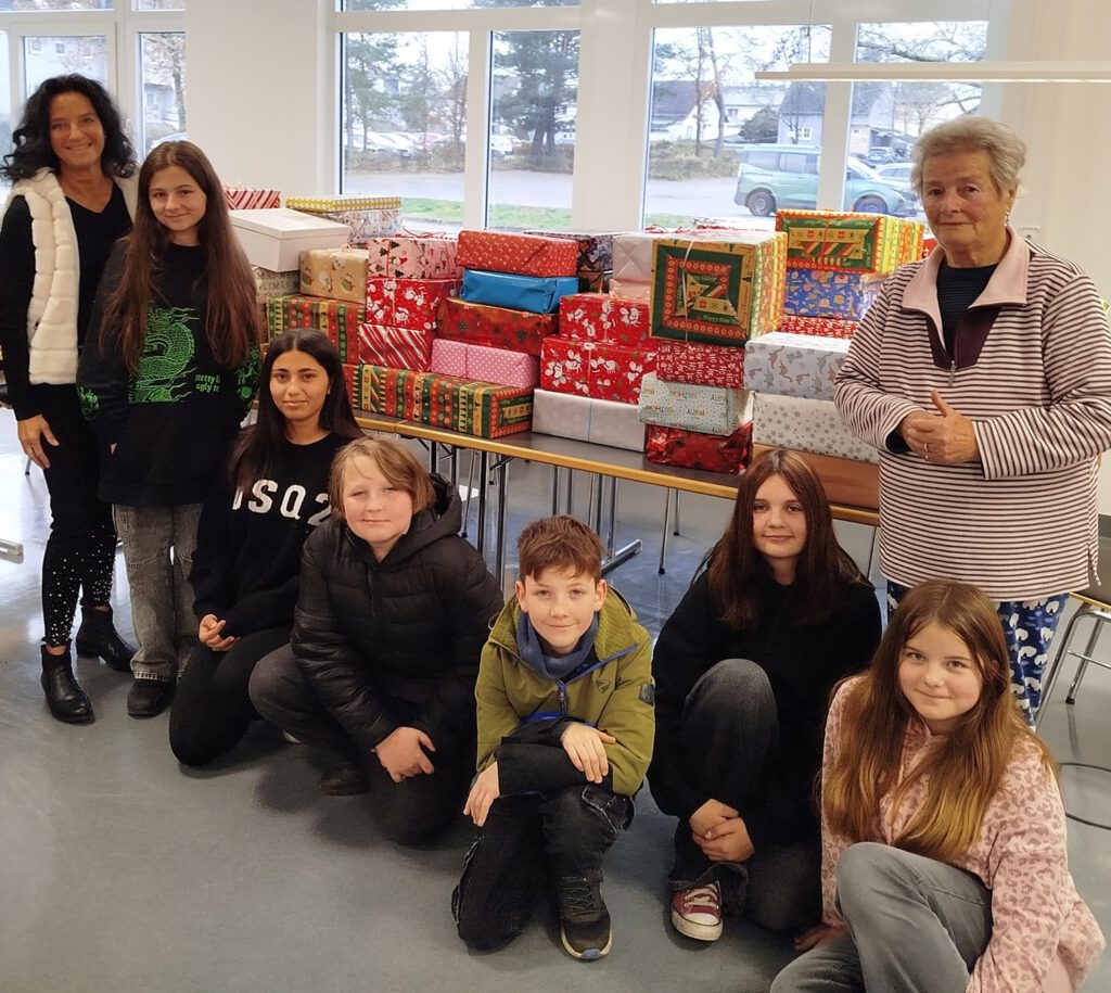 Gegen Ende des Gesprächs bedankten sich alle Zuhörenden sehr herzlich bei der Seniorin für ihr außerordentliches Engagement und darüber hinaus für manch spannende Geschichte aus einem bewegten Leben. „Ich fand’s sehr toll, dass Sie da waren und dass Sie das machen“, so eine Sechstklässlerin aus der Redaktion der Schülerzeitung. Die neue Koordinatorin der Weihnachtspäckchen-Aktion Alicia Groß bedankte sich im Rahmen der Päckchenübergabe zudem bei allen Spenderinnen und Spendern in und außerhalb der Schulgemeinde.